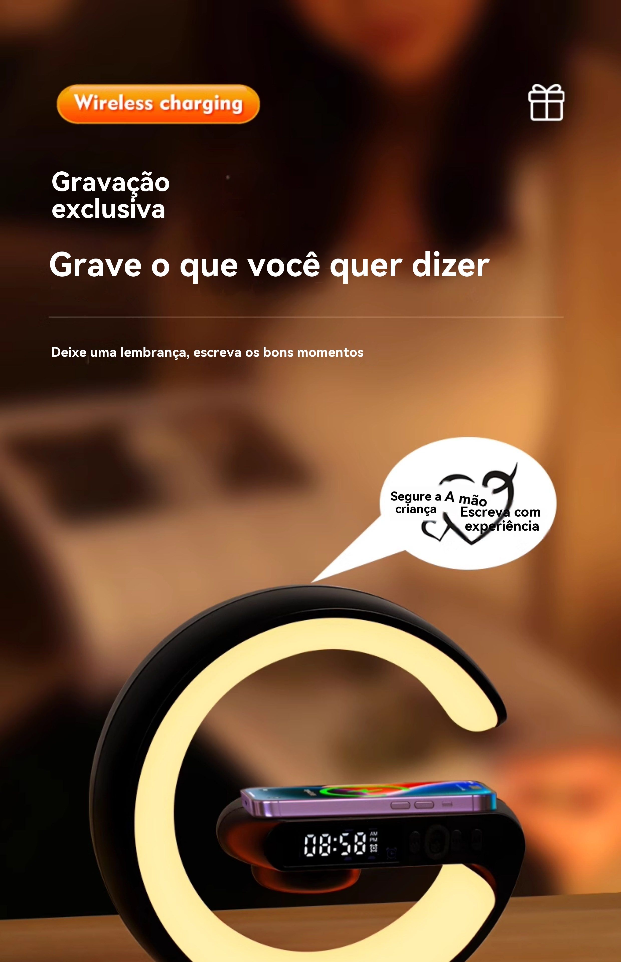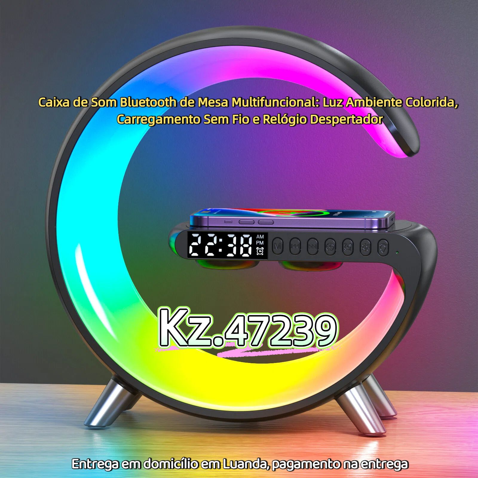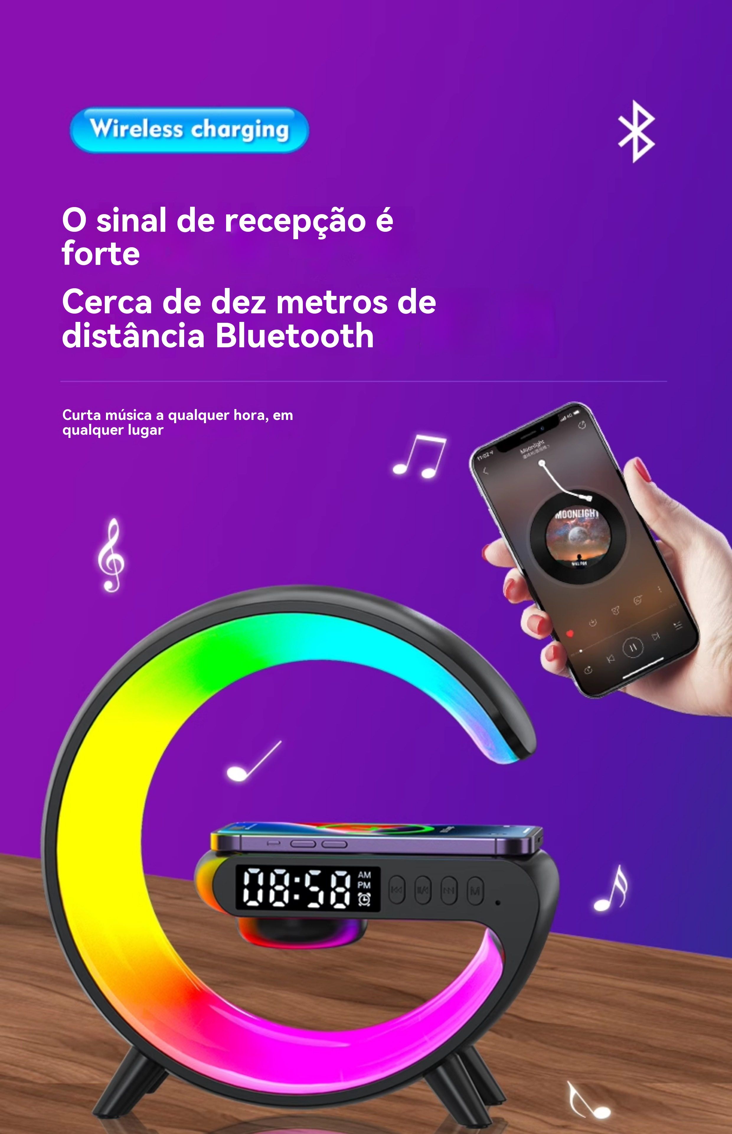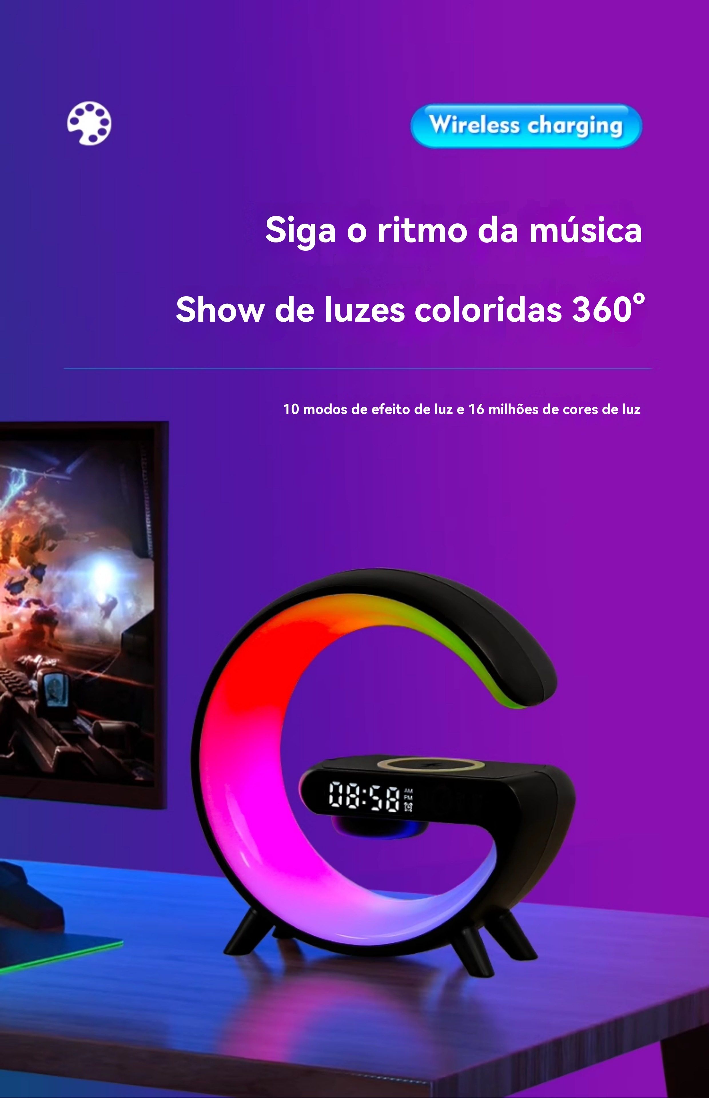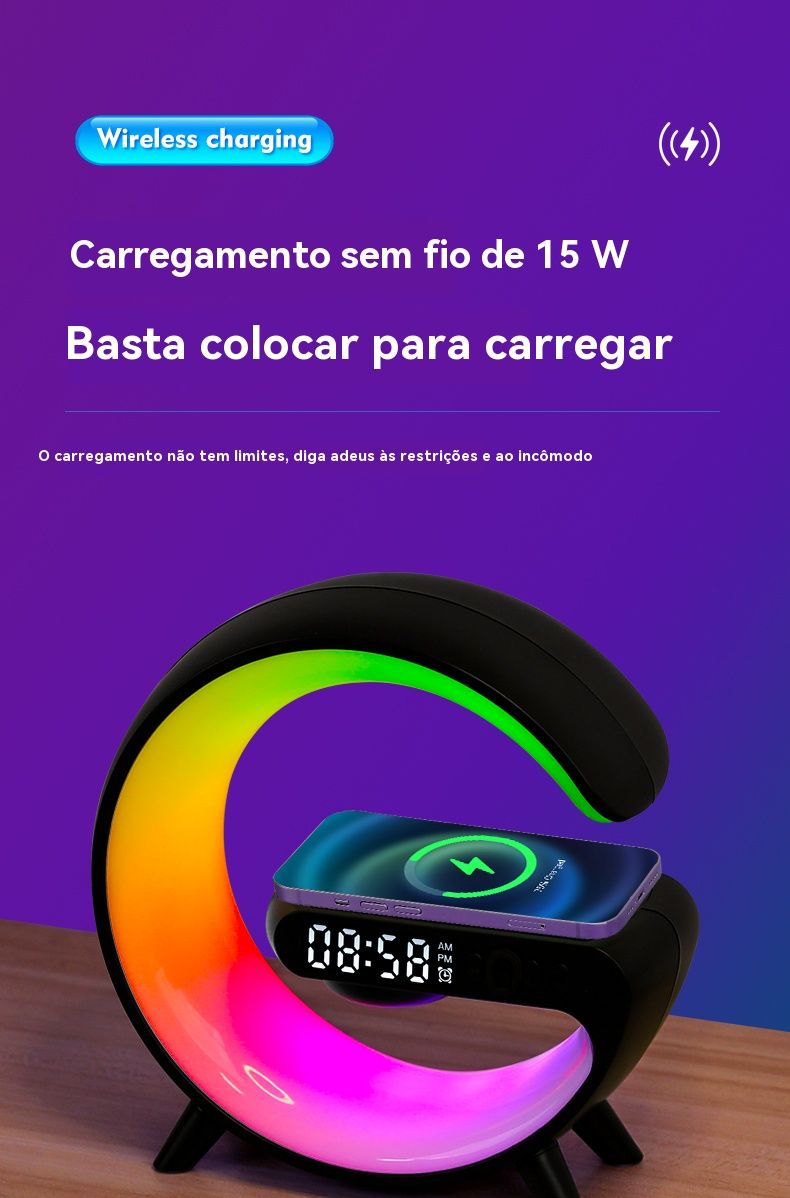 Caixa de Som Bluetooth de Mesa Multifuncional: Luz Ambiente Colorida, Carregamento Sem Fio e Relógio Despertador